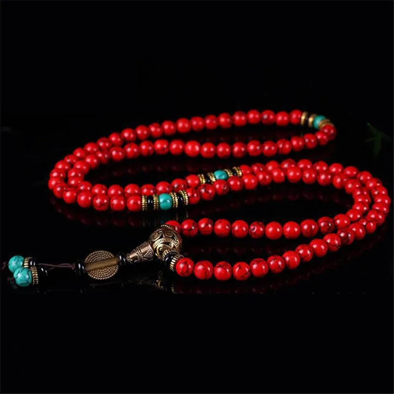 Tibetaanse Mala – Halsketting of Armband – Rode, turquoise en zwarte steentjes met goud