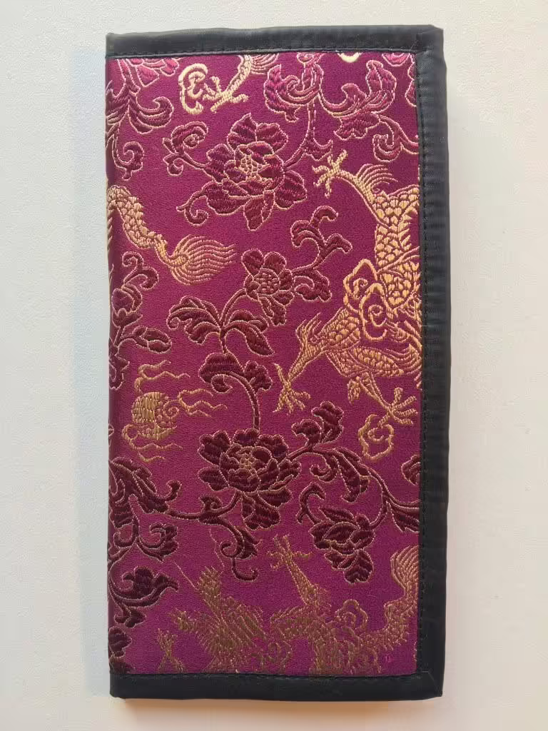 Mooie paarskleurige brokaten portemonnee of wallet. Om handig in 7 vakjes waarvan 2 met rits je waardevolle spulletjes in op te bergen. Dit tasje is geborduurd met lotusbloemen en symbolen. Handige sluiting met klittenband.